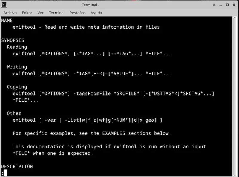 ExifTool es un software libre que se usa para leer, escribir y manipular metadatos en archivos multimedia como imágenes, vídeos y audios. Es una herramienta de línea de comandos muy potente y versátil que puede trabajar con más de 23.000 tipos de etiquetas de metadatos diferentes y diversos formatos, entre ellos EXIF, IPTC, XMP.