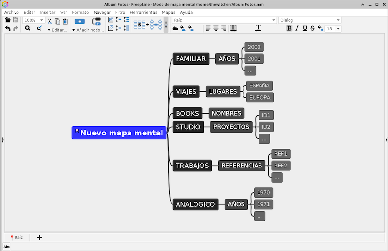 Una vez elaborados los directorios, de cada directorio creo un árbol de trabajo (subdirectorios), y para ello uso un programa de mapa mental, por ejemplo Freeplan, para organizarme bien. Por ejemplo, puedes crear un catálogo (llámalo como quieras) y, a partir de ahí, creas la primera estructura: familia, viajes, trabajos, estudio, books, etc. Y una vez desde esa estructura, lo fragmento en subdirectorios por años y, dentro de los años, por tema. Esto sería sobre la estructura del catálogo; es mi ejemplo y estoy seguro de que los habrá mejores.